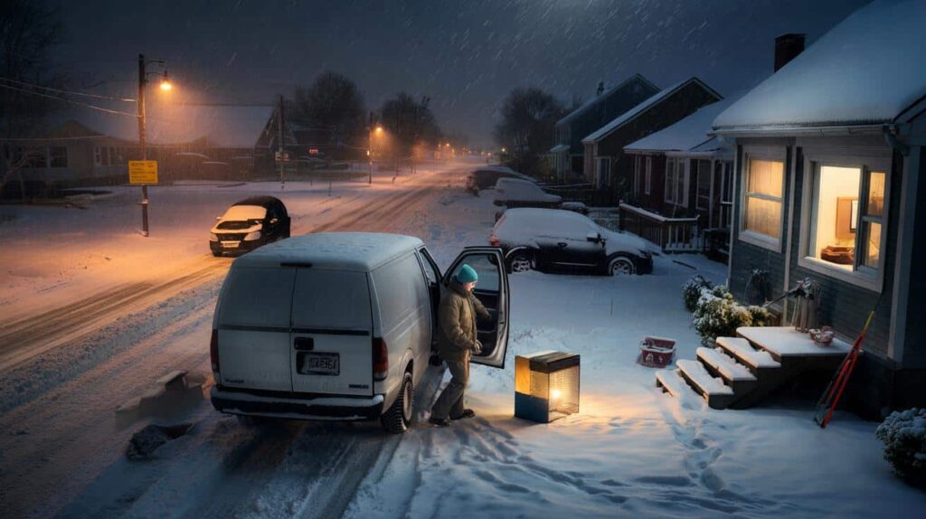 On a side street just outside town, a delivery driver named Mark checks his phone between runs. He’s got two more stops before he can go home, but the radar map is filling in fast with angry shades of blue and purple. His van’s tires are already slipping a little at every stop sign.