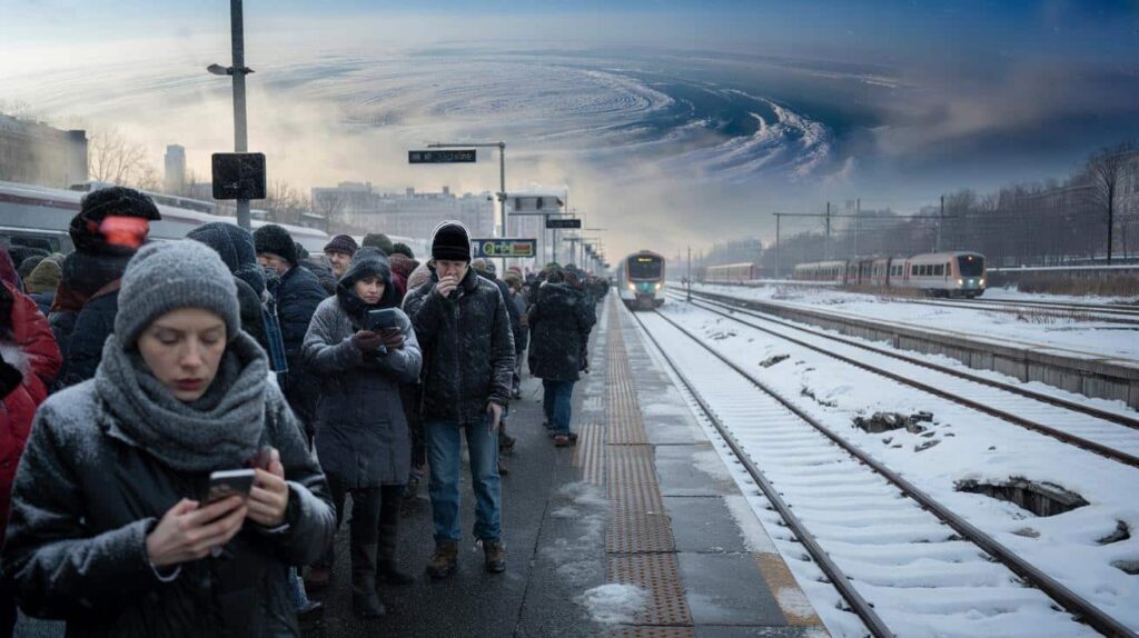 On the platform just after 7 a.m. breath formed small white clouds while the departure board showed yellow warnings. The normal sounds of podcasts and sleepy conversations changed to something more urgent as people checked weather apps and looked up at the sky. They scrolled through group chats looking for information about school closures and train delays.