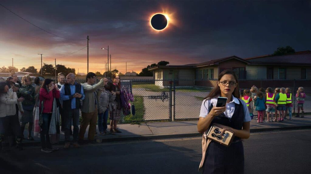 At 1:23 p.m. the playground becomes unusually silent. The morning light that has been bright and harsh suddenly becomes gentler like someone adjusted a universal light switch. A group of children at Jefferson Elementary still wearing their bright safety vests from lunch duty look up at a sky they have been warned not to stare at. Inside the building a principal’s phone keeps buzzing with emails from parents and messages from the district and a worried text from a teacher who left her eclipse glasses at home. The longest solar eclipse of the century is moving across the sun and nobody really knows what to do with a school full of students. Some schools have closed for the day while others have decided to stay open. In the dim afternoon light a very current question looms over the playground. Who is really in charge here?