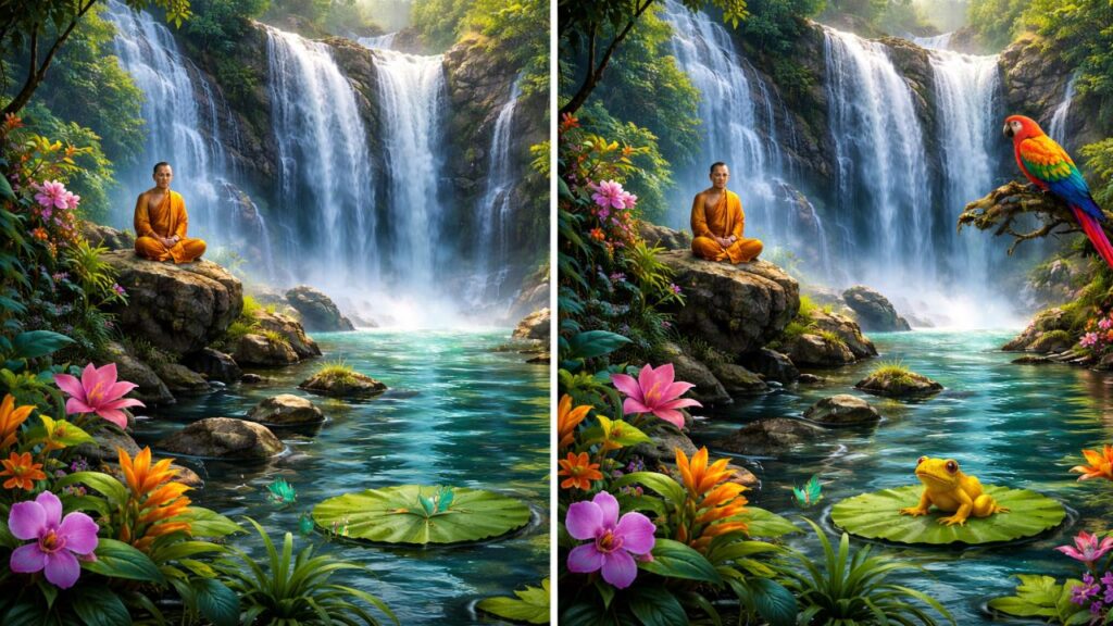 Your brain tends to see the overall scene before noticing smaller details. When you view the waterfall image your mind recognizes it as a peaceful nature picture and thinks both versions match. This creates a situation where your eyes miss small changes because the general appearance seems identical. The alterations are hidden in spots that naturally blend into the background like tiny animals or decorative features that don’t stand out right away. To spot these differences you need to look carefully and pay close attention to every part of the image instead of relying on your first impression.