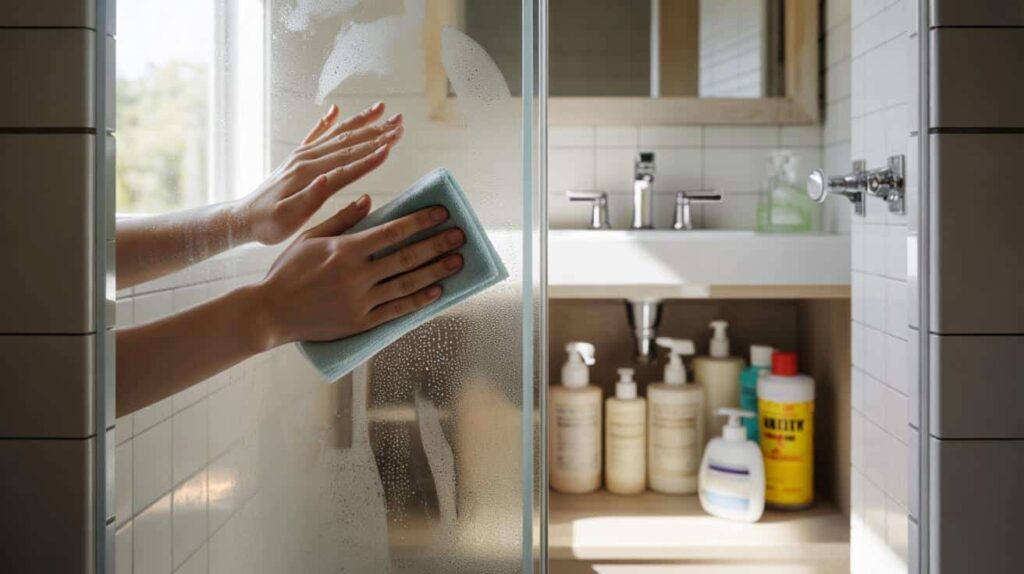 • Bring in simple tools: a shower squeegee, microfiber cloths, a small scrub brush for corners.