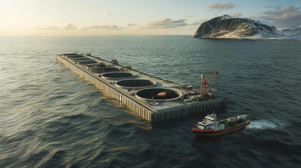 The structure carries a name reminiscent of a cargo ship: Havfarm 1. It measures an impressive 385 metres in length and 59.5 metres in width. However it remains almost stationary. Positioned roughly 5 kilometres from Hadseløya island in Norway’s Vesterålen archipelago it operates as a floating fish farm instead of a conventional vessel.